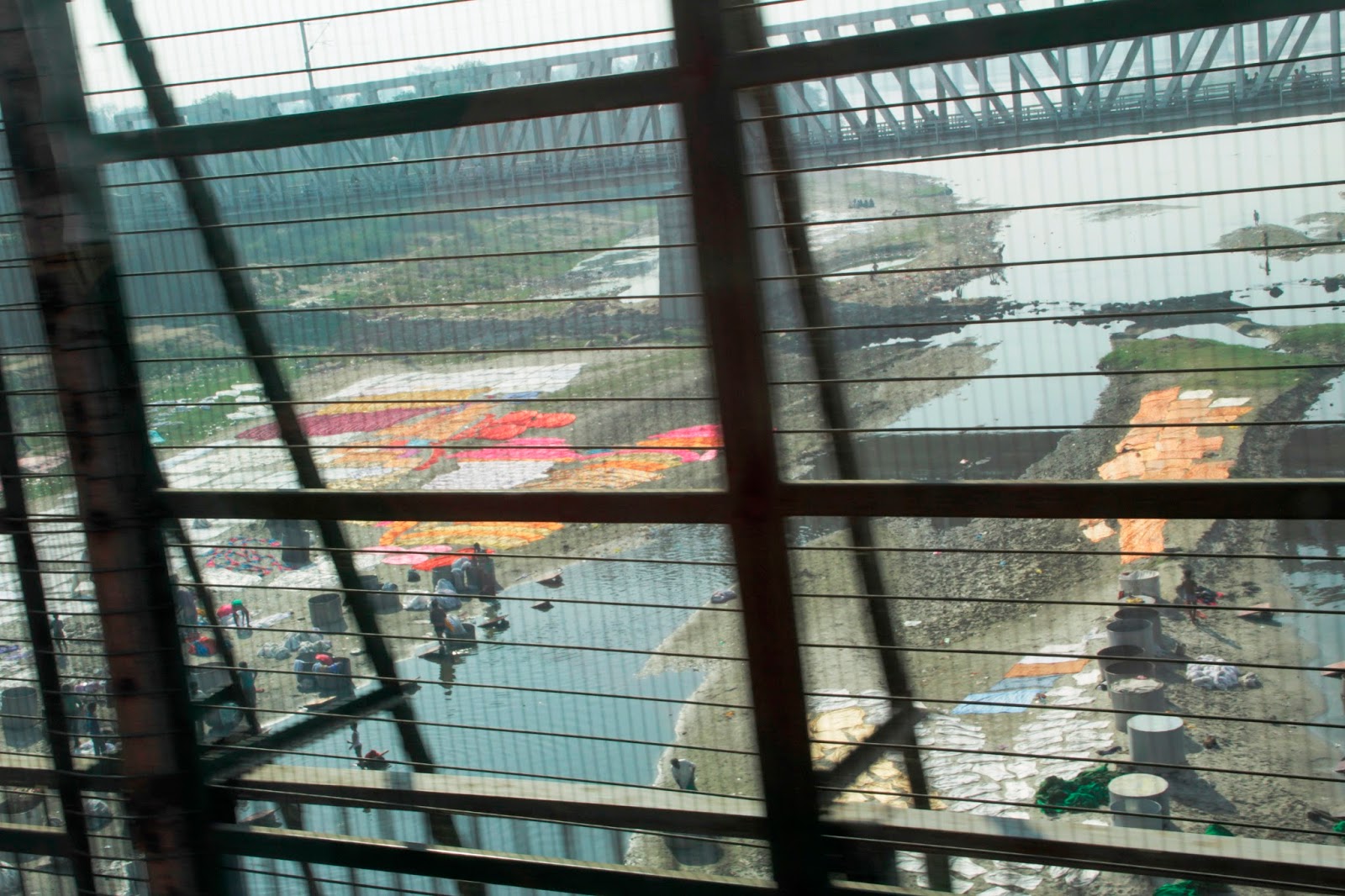 The view from a bridge. Notice the bridge is enclosed with a steel fence. U go figure! At the river bank, you can see thriving laundry activities using Yamuna River as the source of water.